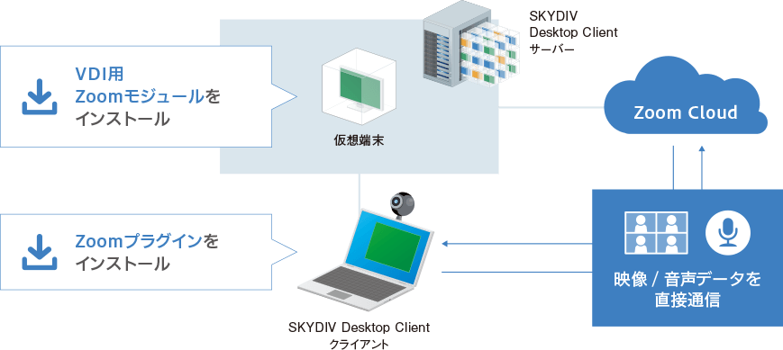 「Zoom」をご利用の場合に、仮想端末とお客様が使用されるPCの両方にVDI用Zoomモジュールやプラグインをインストールすることで、Web会議中のネットワーク負荷を軽減できます。(詳しい導入手順については、「保守契約ユーザー用Webサイト」をご覧ください。)