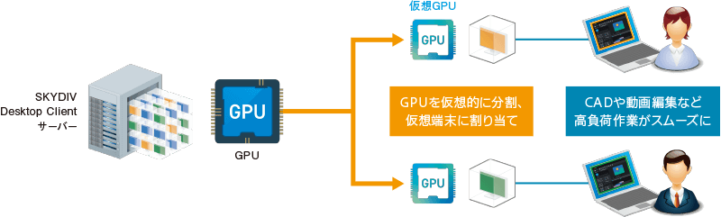 SKYDIV Desktop Clientサーバー上のGPUを仮想的に分割し、各仮想端末で利用。CADや3Dモデリング、動画編集などの高負荷なグラフィック処理を必要とする作業を、仮想端末上で快適に行うことができます。