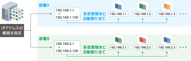 アラート通知メールの設定あらかじめIPアドレスの範囲を指定しておくことで、各仮想端末への割り当てを自動で実施。別途DHCPサーバー※1を利用しなくても、SKYDIV Desktop Client上で一元管理できるため、仮想端末の追加や設定変更がスムーズに行えます。