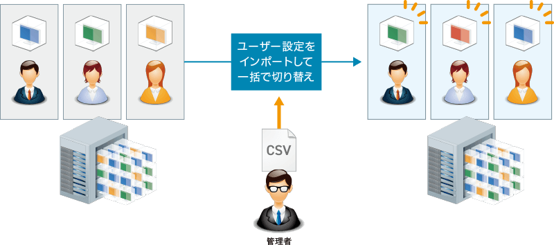 CSV形式のファイルによる一括設定で、複数の仮想端末へのユーザー割り当てをまとめて変更※1。新年度など従業員の異動が多く発生する時期に、PC利用環境の切り替えをスムーズに実施できるように運用管理をサポートします。