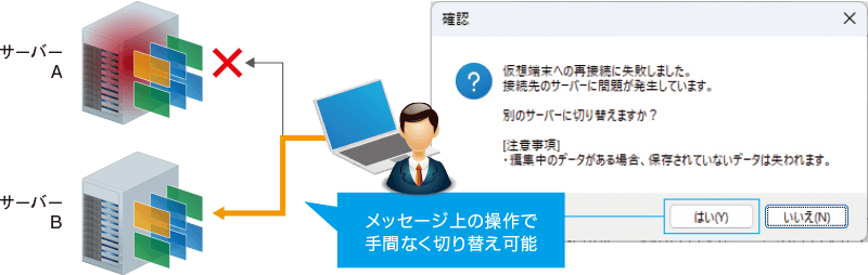 SBC(RDS)方式をお使いの場合に、仮想環境への接続中にサーバー障害が発生しても、利用者自身でサーバーを切り替えて継続して利用いただけます。画面上のメッセージに従って操作するだけで接続が完了するため、管理者に問い合わせる手間もかかりません。