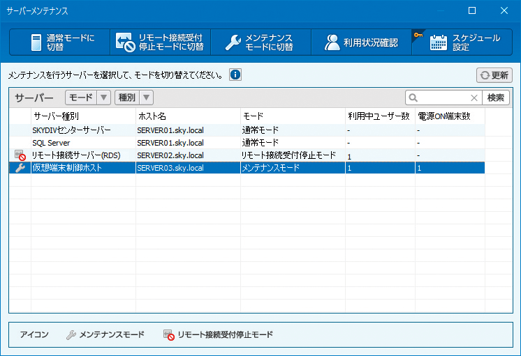 サーバーのメンテナンス作業時に、仮想端末への新規の接続を禁止する「メンテナンスモード」へ素早く切り替えが行えます※。また、管理画面上で仮想端末の利用状況を確認したり、仮想端末のログオフ / 電源OFFも行え、スムーズに作業が開始できるよう支援します。