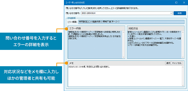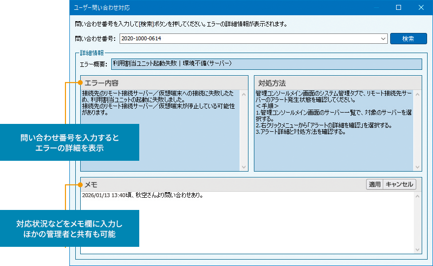 仮想端末が起動できないなどの問題が起きた場合には、問い合わせ番号が記載されたエラーメッセージを利用者のPC画面に表示※1。利用者が状況をうまく説明できない場合でも、管理者はその番号からトラブルの詳細を把握できるため、対処が素早く行えます。