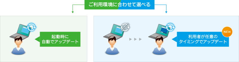 利用者側のPCと職場の接続対象PCそれぞれで、業務への影響を避けながらアップデートが可能です※1。