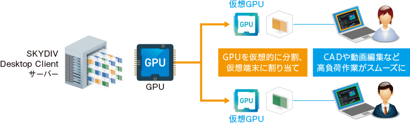 SKYDIV Desktop Clientサーバー上のGPUを仮想的に分割し、各仮想端末で利用可能に。