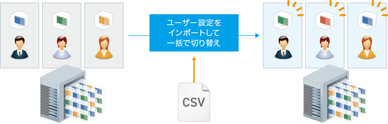 CSV形式のファイルによる一括設定で、複数の仮想端末へのユーザー割り当てをまとめて変更可能に※1。