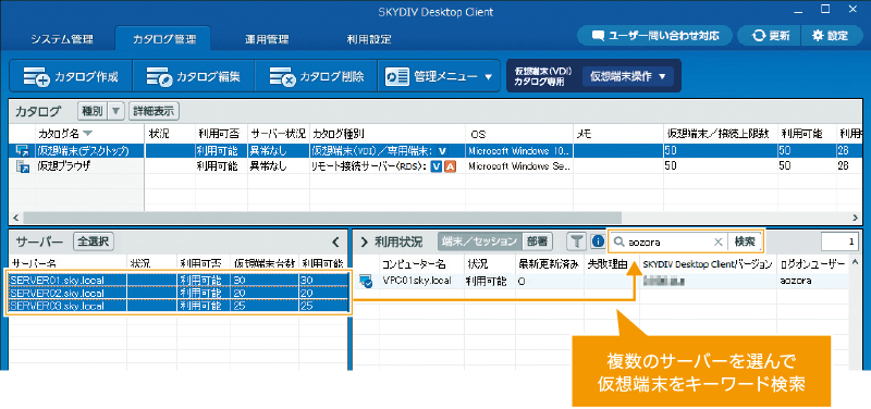 管理画面の検索性がさらに向上。複数台のサーバーで仮想端末を管理している場合に、サーバーを複数選択した状態で端末を一度に絞り込めます。